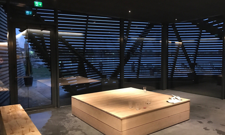 Modern seaside sauna with a stylish, glass-walled restaurant & large deck for sweeping views.